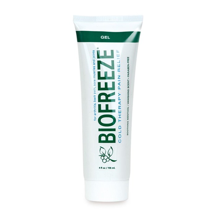 - Biofreeze Pain Relieving Gel dispensed from a tube affords the opportunity to create a more thorough experience by massaging the affected area during application. This hands-on application also reinforces touch which has been shown to be very important in the healing cycle.