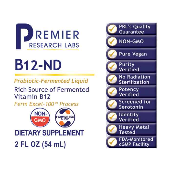 B12-ND by Premier Research Labs is a rich, live source of vitamin B12 in preferred probiotic-cultured forms.
