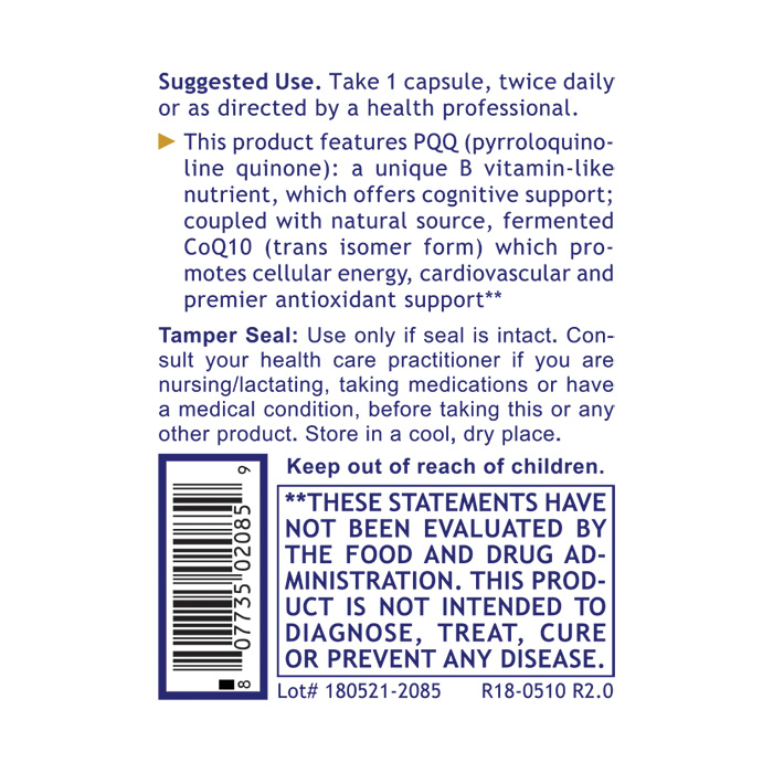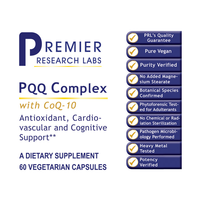 Premier PQQ Complex with CoQ10 features PQQ (pyrroloquinoline quinone), a unique B vitamin-like nutrient. It offers nerve, cardiovascular and cognitive (learning and memory) support. This formula is coupled with natural source, fermented CoQ10 (trans isomer form) which promotes cellular energy and offers premier antioxidant support. This formula is anchored by PhytoMarine Support, a biocompatible botanical blend that offers broad spectrum phyto-nutritional support.